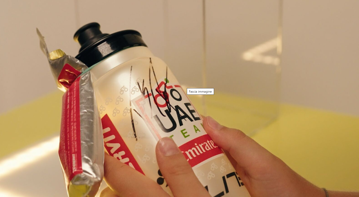 Milioni di spettatori hanno visto quei dieci secondi di gara. La borraccia al centro di tutto era di Elite. Emozionata dal gesto del campione, Elite ha deciso di organizzare un incontro tra il giovane tifoso e il suo idolo e permettere così a Tadej Pogačar di autografare quella borraccia diventata ormai iconica.
