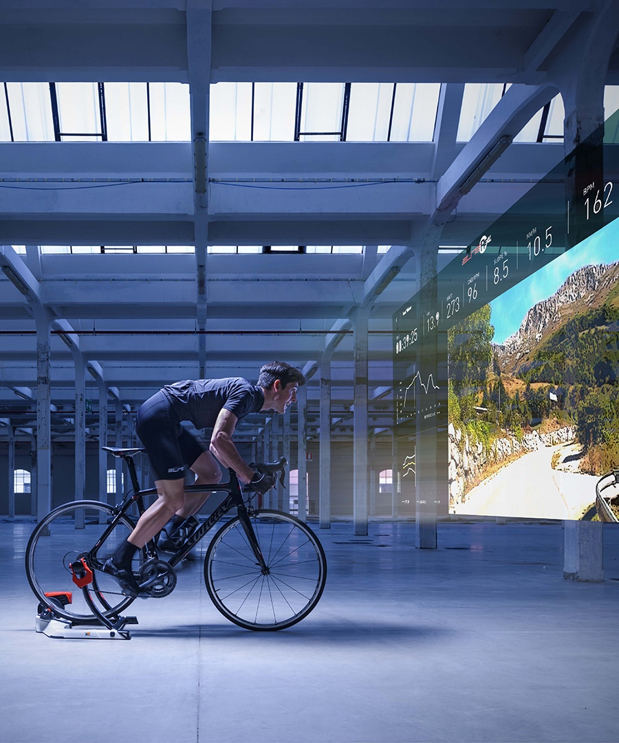 Avvii un percorso e il trainer adegua la resistenza alla pendenza, con velocità video sincronizzata al tuo passo, per lavorare su potenza e cadenza con le stesse sensazioni che avresti su strada.