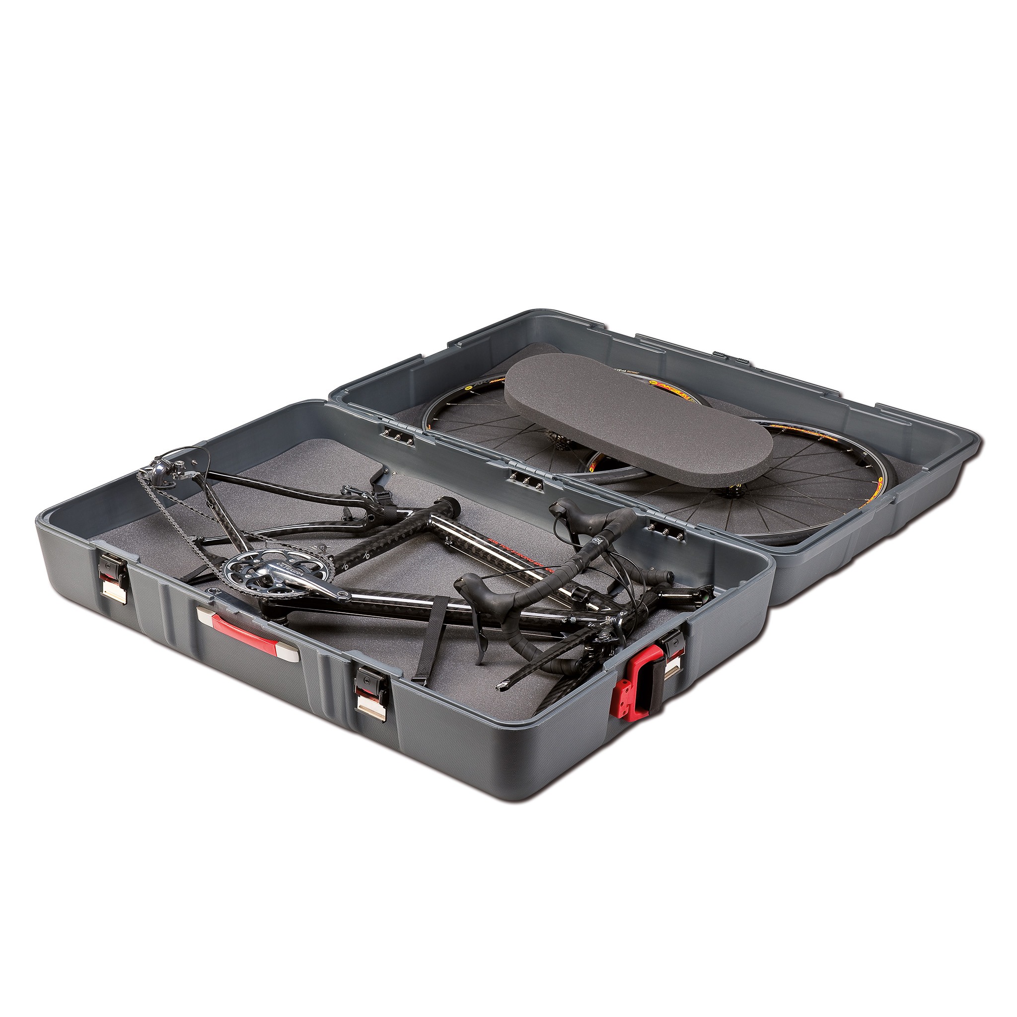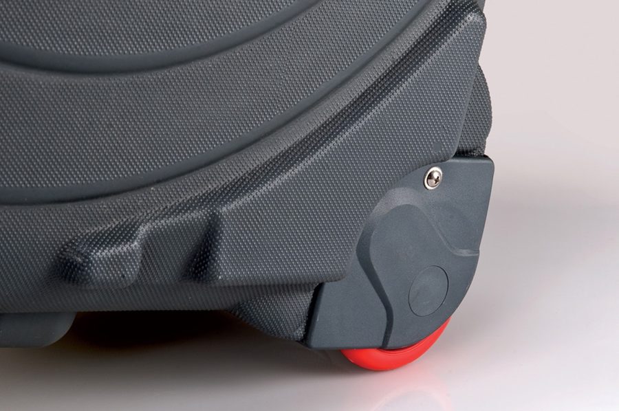Il guscio esterno della valigia portabici di Elite è realizzato in polietilene extra resistente a doppia parete, progettato per assorbire impatti, urti diretti e compressioni durante il trasporto. L’interno ospita tre separatori in poliuretano espanso, che si adattano al profilo della bici e proteggono ogni parte da sfregamenti e colpi. Il terzo separatore è dedicato alla protezione di ruote e raggi.